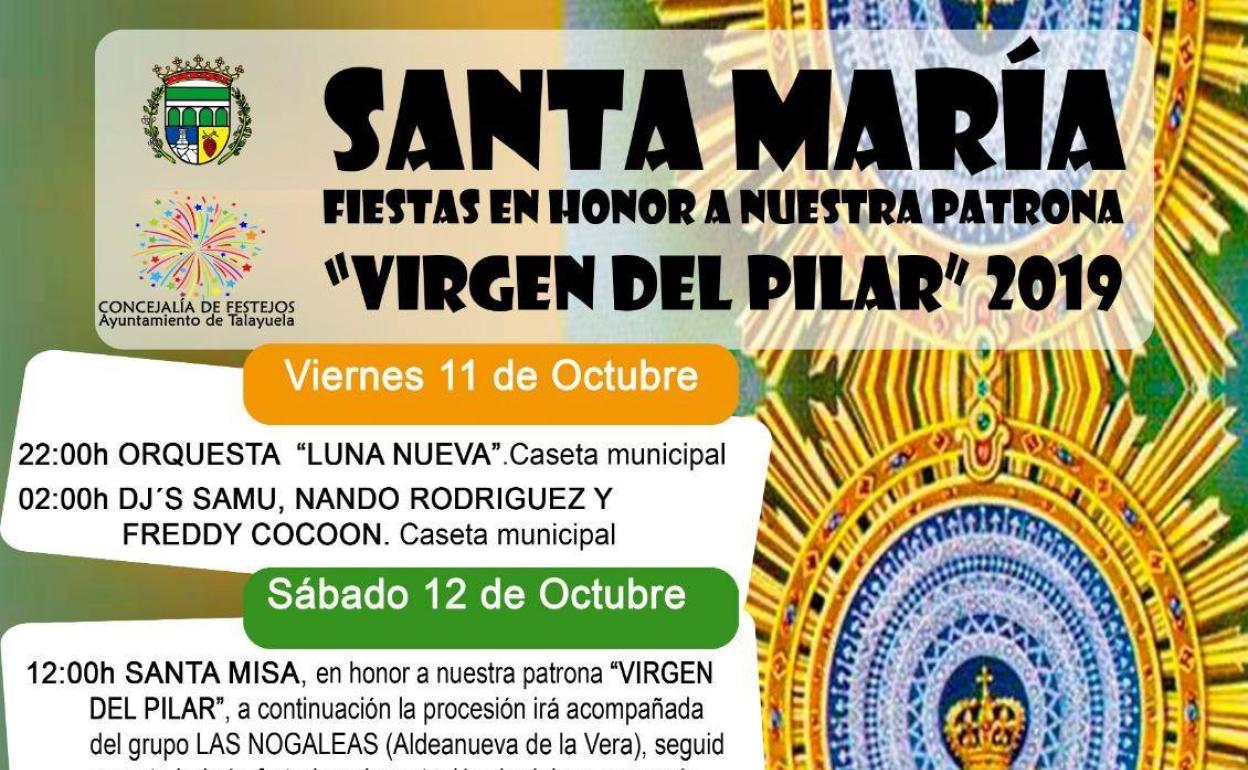 La concejalía de Festejos del Ayuntamiento de Talayuela ha dado a conocer la programación de las próximas Fiestas de la Virgen del Pilar en Santa María de las Lomas que se celebrarán del 11 al 14 de octubre.
