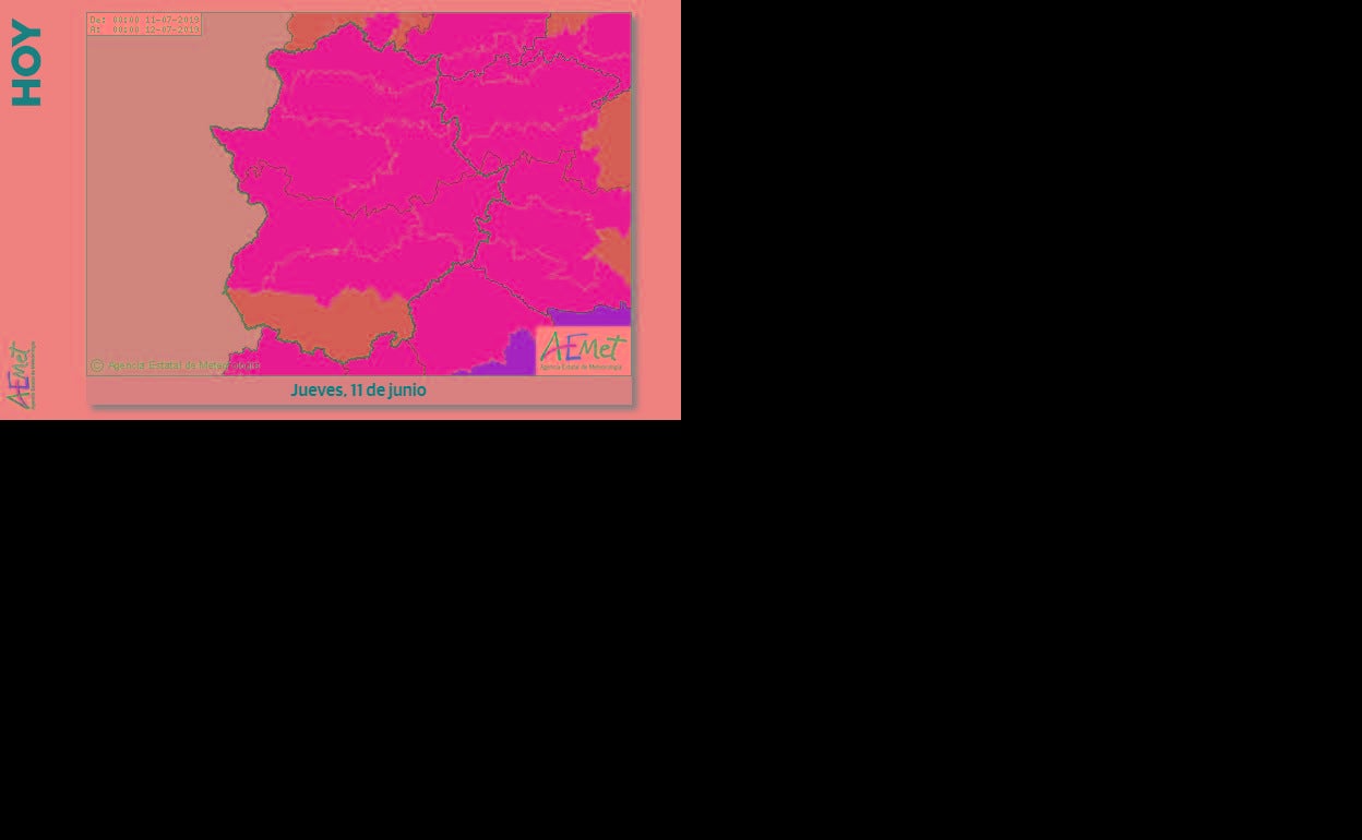La Aemet tiene activos los avisos en toda la provincia de Cáceres y en toda la pacense, a excepción del Sur. La alerta permanecerá activa de 13 a 21 horas.