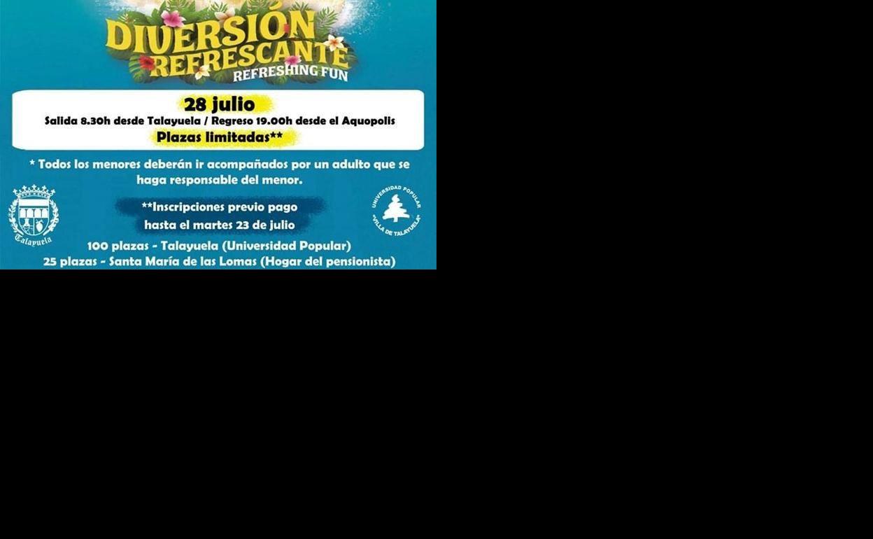 El Ayuntamiento de Talayuela, organiza un viaje al Aquopolis que se realizará el próximo 28 de Julio. Tras la buena acogida de la actividad, el ayuntamiento talayuelano ha ampliado el número de plazas para la excursión que tendrá un coste de 15 euros.