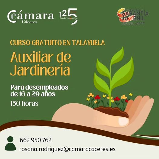 La Cámara de Comercio de Cáceres ofrece en Talayuela un curso gratuito para desempleados de 16 a 29 años. Será de auxiliar de jardinería, con una duración de 150 horas e impartido a través del Programa Integral de Cualificación y Empleo PICE para fomentar el empleo juvenil.