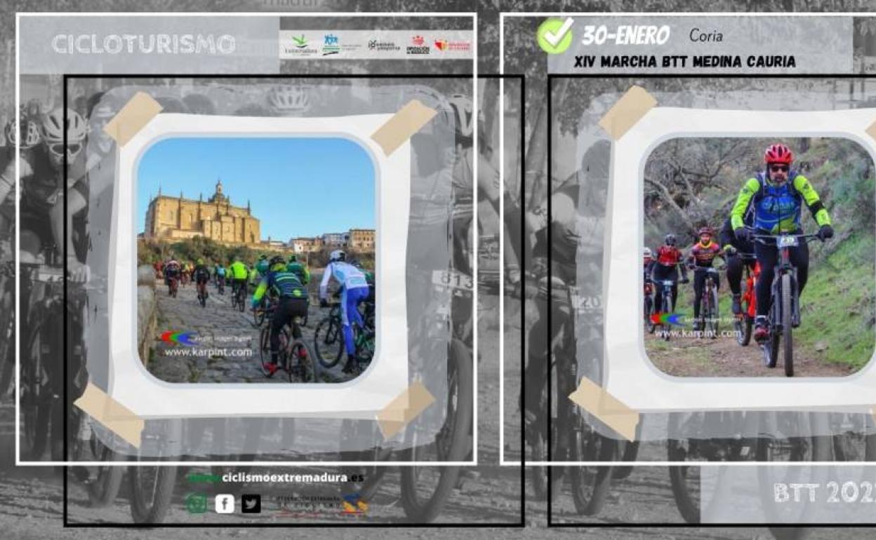 El domingo 30 de enero, se celebró en la ciudad de Coria la XIV Marcha BTT Medina Cauria 2022, organizada por el Club Ciclista Cauriense y la Federación Extremeña de Ciclismo, con la colaboración de la Concejalía de Deportes del Ayuntamiento de Coria en la que participaron 250 ciclistas de diferentes localidades: Acehuche, Aceituna, Aldealengua, Aldeanueva de la vera, Aldeanueva del Camino, Aliseda, Arroyo de la Luz, Béjar, Bienvenida, Bilbao, Cabezabellosa, Cáceres, Casar de palomero,Calzadilla,Cilleros, Ciudad Rodrigo, Coria, Eljas, Gata, Guijo de Galisteo, El Batán, Herrera de Alcántara, Hervás, Hinojal, Holguera, Huelaga, Jaraíz de La Vera, Jerez de los caballeros, Lagunilla, Llerena, Madrigalejo, Malpartida de Cáceres, Malpartida de Plasencia, Montijo, Moraleja, Móstoles, Navalmoral de la Mata, Plasencia, Portaje, Puebla de la Calzada, Salamanca, San Vicente de Alcántara, Los Santos de Maimona, Saucedilla, Soria, Talayuela, Torrejoncillo, Valverde del Fresno, Villamayor, Villaviciosa de Odón, Zarza la Mayor.