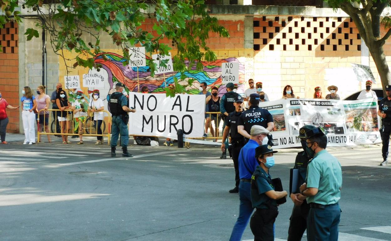 Por otra, los integrantes de la plataforma No al Muro, situados en varios puntos del recorrido, donde se lo permitieron, para hacer visible, con sus pancartas y cánticos, su demanda del tren soterrado a su paso por el casco urbano.