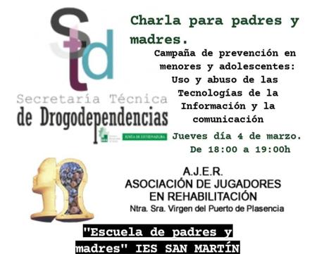 La Escuela de Padres y Madres del IES San Martín de Talayuela organiza una charla de formación para madres y padres llamada 'El uso y abuso de las tecnologías de la información y la comunicación'.