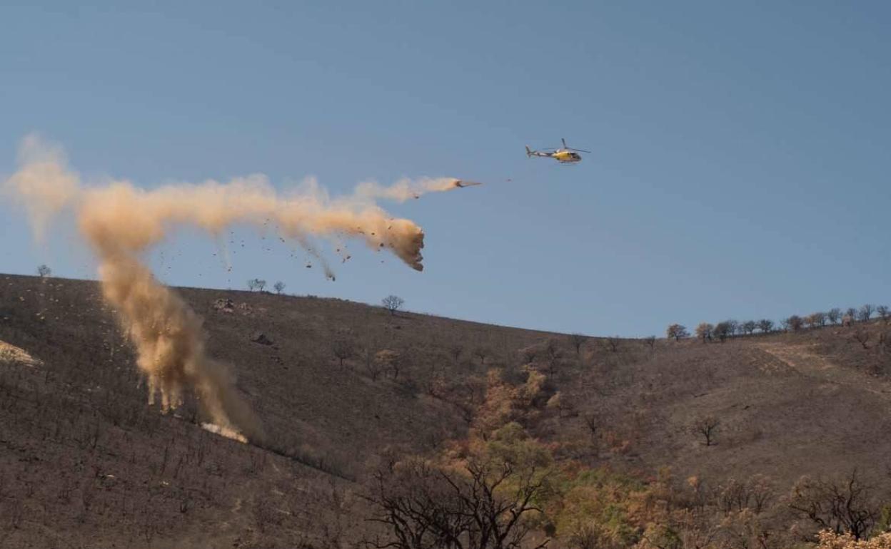 Comienzan los trabajos para la restauración forestal en las ZAU por los incendios de Hurdes y Miravete con el lanzamiento de paja desde helicópteros