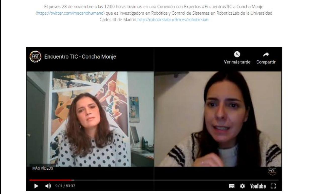 Este 28 de noviembre, a las 12 de la mañana, Concha Monje ha intervenido en directo en Experiencias TIC - Conexiones con Expertos que realiza AUPEX a través del Plan de Alfabetización Tecnológica. Durante esta actividad se han abordado cuestiones como las habilidades STEAM en el actual mercado laboral, cuál es el estado de su proyecto de investigación más importante hasta el momento (el robot TEO), la diferencia entre Robótica o Inteligencia Artificial, o la necesidad de la visibilidad y la participación de la mujer en todos los ámbitos: científico, educativo, tecnológico, etc. Y también ha respondido a las preguntas formuladas por los ciudadanos a través de Twitter relacionadas con el miedo a la pérdida de empleo por la ocupación de puestos de trabajo por los robots o sobre los beneficios que pueden aportar los robots asistenciales.
