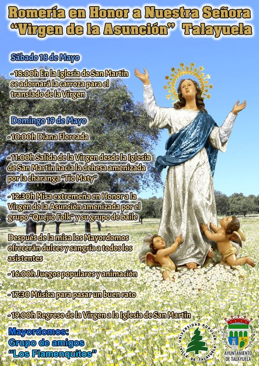 Este domingo, 19 de mayo, se celebrará la romería en honor a la Virgen de la Asunción, si bien en la tarde del sábado se ... hará la ofrenda floral en la iglesia San Martín y se adornará la carroza para el traslado de la imagen. Los mayordomos son los integrantes del grupo de amigos Los Flamenquitos.