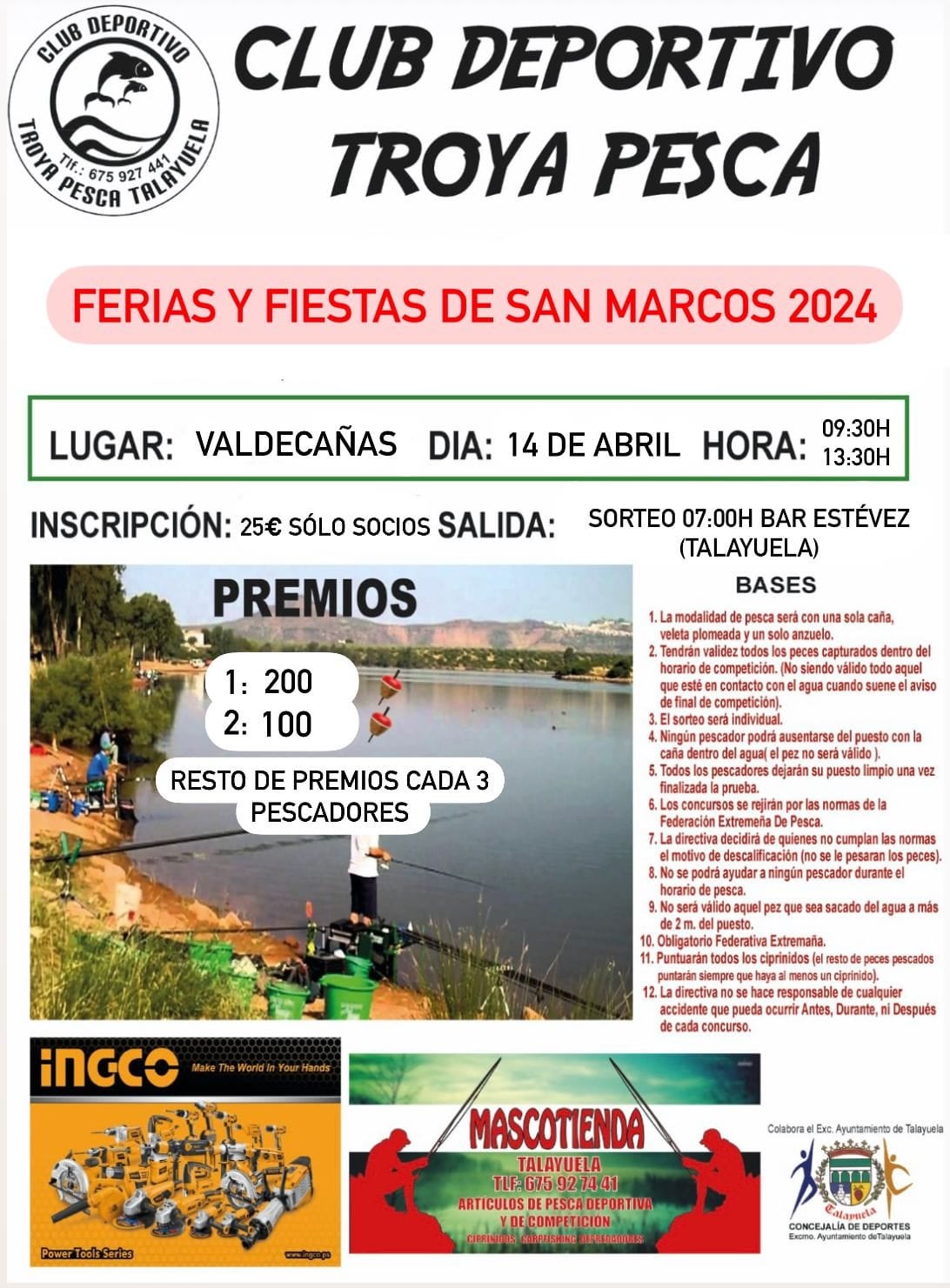Las ya cercanas Ferias y Fiestas de San Marcos contarán con un concurso de pesca, organizado por el club ldeportivo local Troya Pesca con la colaboración de la concejalía de Deportes. Está destinado exclusivamente a los socios de la entidad.