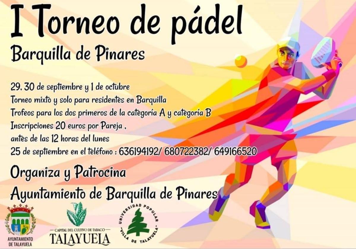 El plazo de inscripción finaliza a las 12.00 horas del 25 de septiembreLos próximos días 29 y 30 de septiembre y el día 1 del próximo mes de octubre, el Ayuntamiento Barquiella de Pinares organizará el I Torneo de Pádel Barquilla de Pinares, junto al Ayuntamiento de Talayuela y a la Universidad Popular 'Villa de Talayuela'.