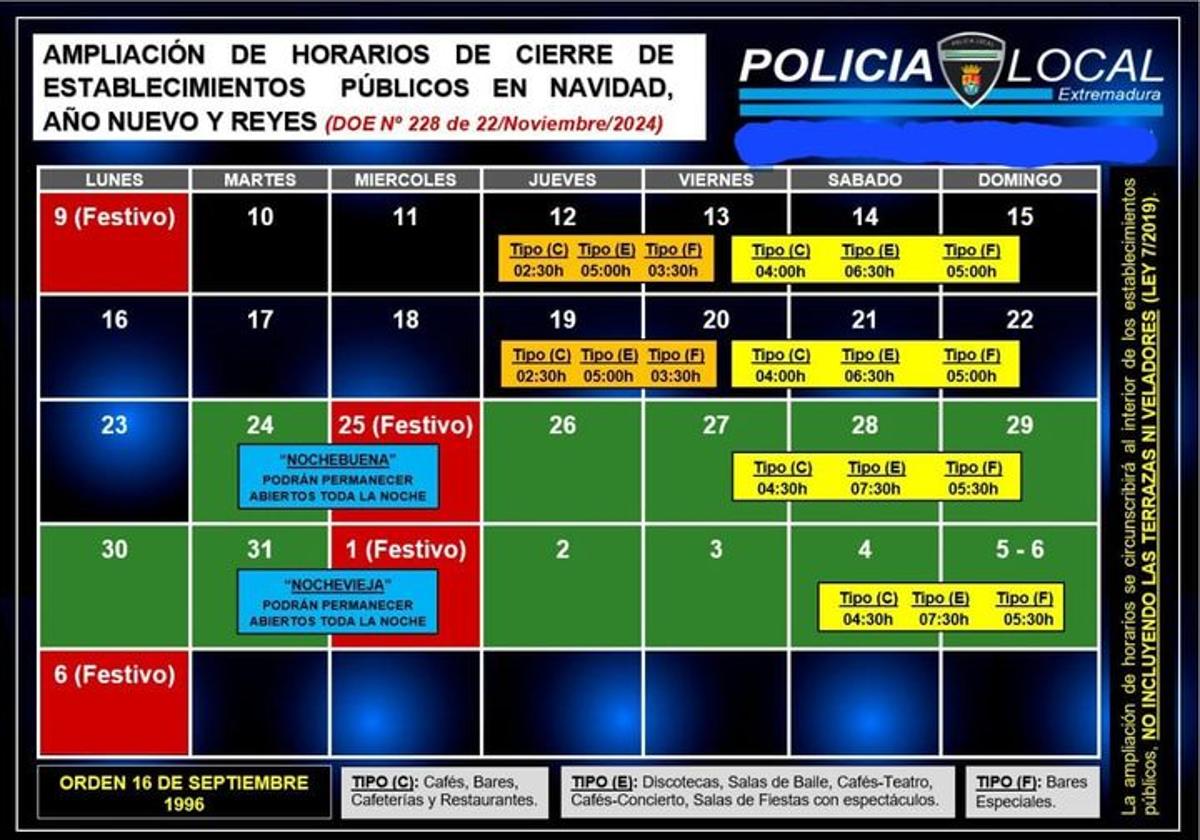 En el DOE del pasado 22 de noviembre se resuelve prorrogar en dos horas, con carácter general para todos los establecimientos públicos principales situados en Extremadura, el horario de cierre establecido según el grupo en el que se encuadre, conforme a lo regulado en el artículo 4 de la Orden de 16 de septiembre de 1996, por la que se establecen los horarios de apertura y cierre de los establecimientos, espectáculos públicos NÚMERO 228 Viernes 22 de noviembre de 2024 60309 y actividades recreativas, durante las madrugadas que transcurren entre los días 13 y 14 de diciembre, 14 y 15 de diciembre, 20 y 21 de diciembre, 21 y 22 de diciembre, 27 y 28 de diciembre, 28 y 29 de diciembre de 2024. También se ampliarán la madrugada del 4 al 5 de enero de 2025 y la madrugada del 5 al 6 de enero de 2025.