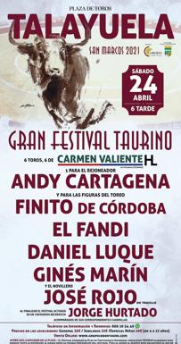 El sábado 24 de abril, a las 18.00 horas de la tarde, tendrá lugar el Festival Taurino, donde se lidiarán 6 astados de la ganadería de Carmen Valiente, para el rejoneador Andy Cartagena, los matadores de toros Finito de Córdoba, El Fandi, Daniel Luque y Ginés Marín, el novillero José Rojo y el becerrista Jorge Hurtado, que al finalizar el festejo actuará en un tentadero.