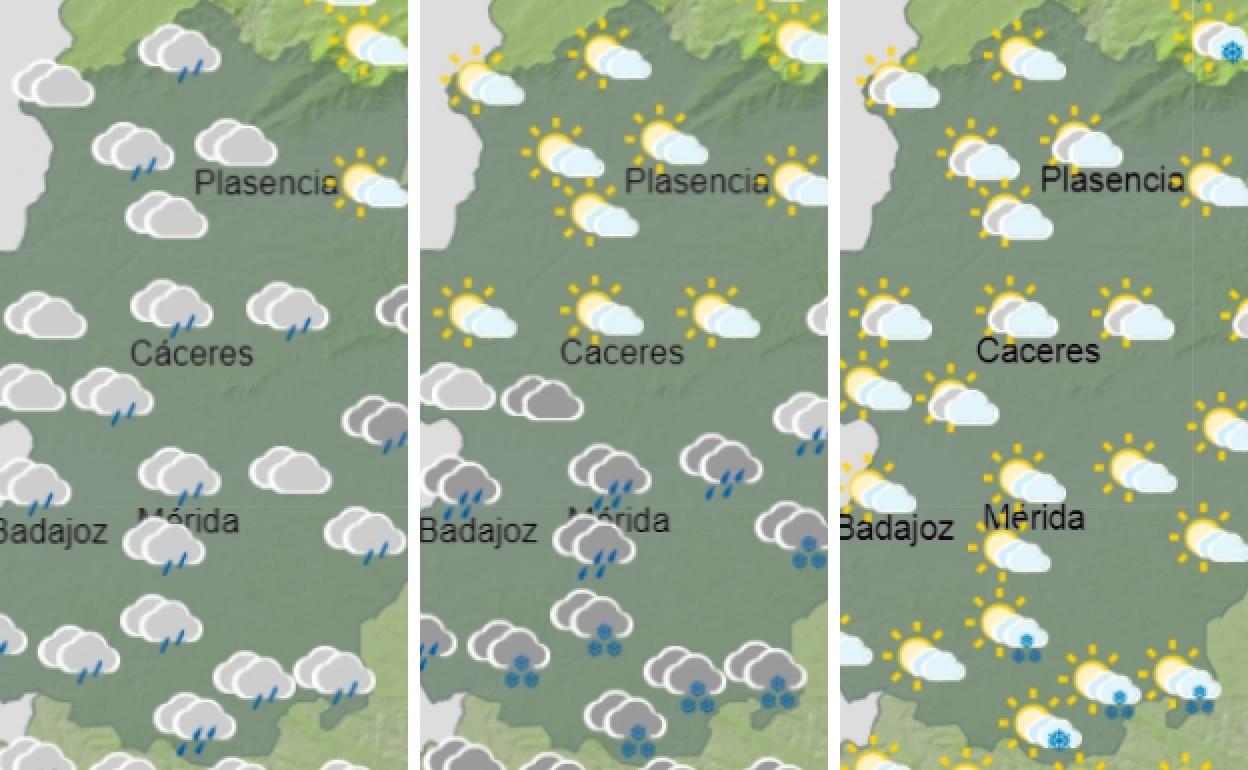 Será a partir del lunes cuando la inestabilidad se instale en la región. Para esta jornada se espera, cielos nubosos con probabilidad de chubascos en el tercio norte en la primera mitad del día. Las precipitaciones se irán generalizando a partir de la tarde. La cota de la nieve se situará en los 1.000 metros en las primeras horas del día en el norte de Cáceres, subiendo de 1.400 a 1.700 metros en general por la tarde. Las temperaturas mínimas irán en ascenso y las máximas en descenso en el norte, aunque continuarán sin cambios en el resto de la comunidad.