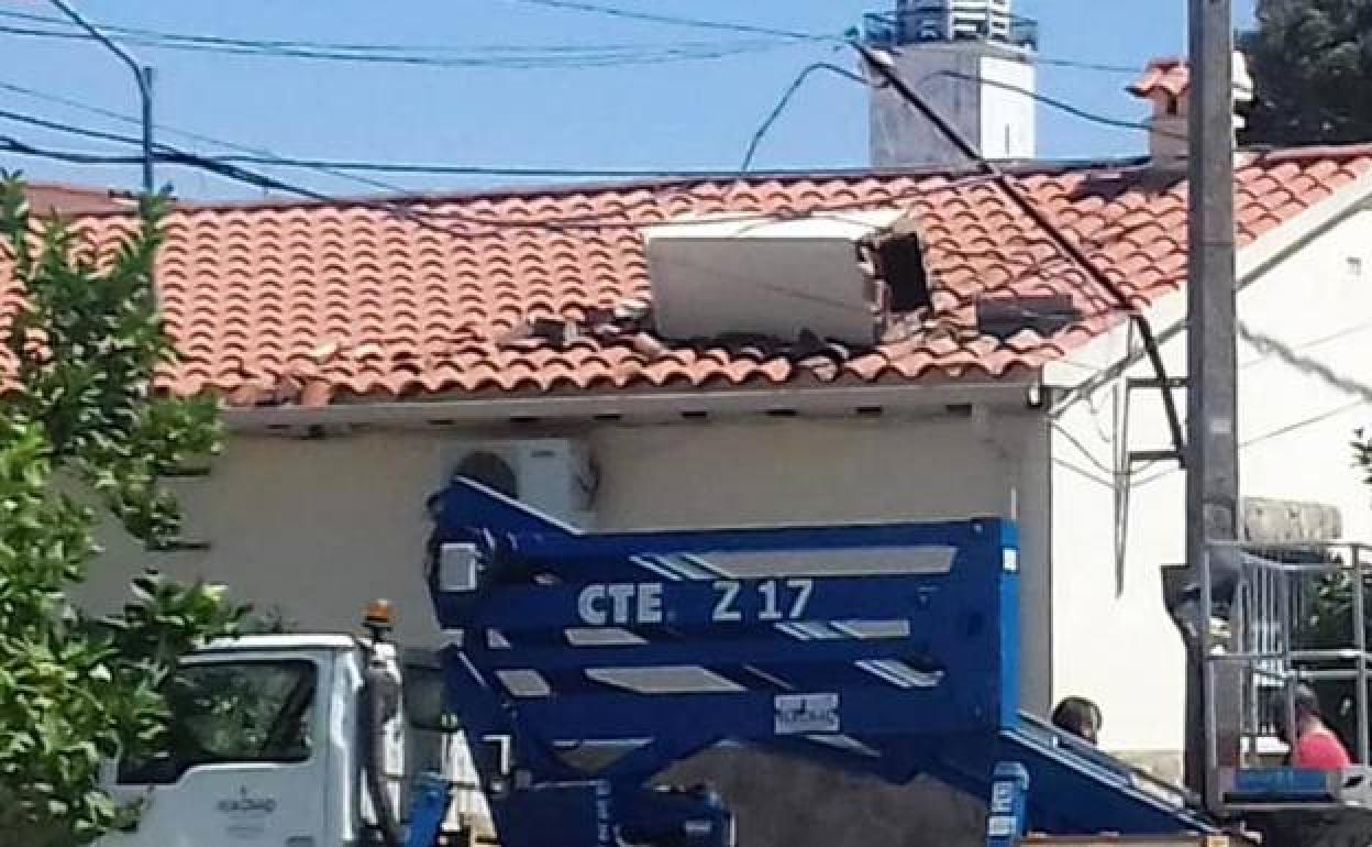Una hormigonera derriba una chimenea en Rosalejo