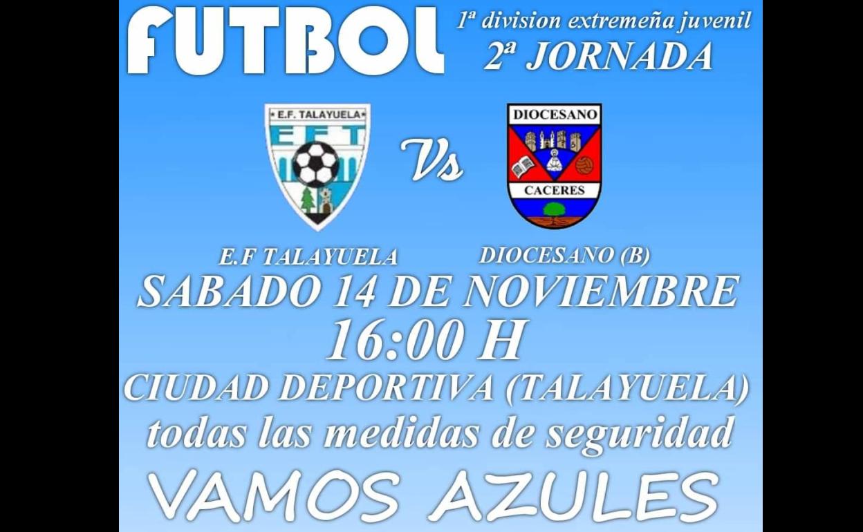 La Ciudad Deportiva de Talayuela acogerá esta tarde de sábado el encuentro más destacado de la segunda jornada de la Primera División Extremeña Juvenil en este grupo 1. Será a las 16.00 horas y el partido enfrentará a la E.F. Talayuela «A» y al C.D. Diocesano «B», cuarto y segundo clasificado respectivamente.