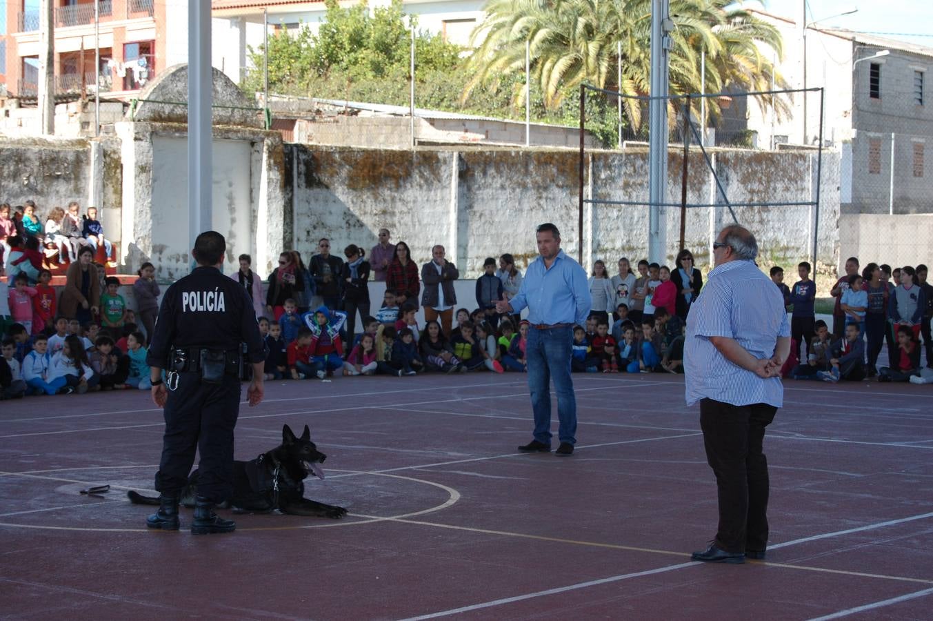 Los agentes realizaron diferentes charlas a los alumnos de 6º de Educación Primaria y alrededor de las 12.00 horas todos los alumnos pudieron observar la destreza olfativa y agilidad de estos animales con una exhibición en la pista cubierta.