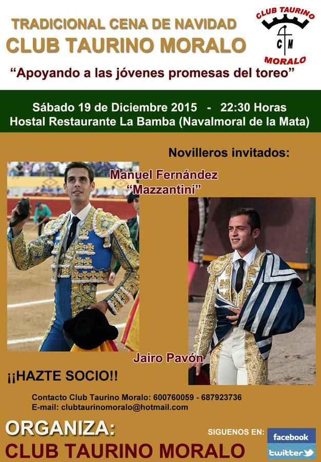 El cordobés Manuel Fernández "Mazzantini", novillero puntero y próximo a la alternativa, y el extremeño Jairo Pavón, joven promesa vecino de Rosalejo, serán los invitados ... de honor de la tradicional cena de Navidad del Club Taurino Moralo.