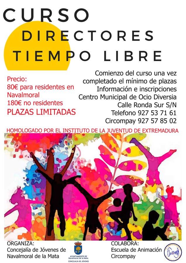 La concejalía de Jóvenes de Navalmoral de la Mata y la Escuela de Animación Circompay informan de la ampliación de plazo para la inscripción en ... el curso de Director de Ocio y Tiempo Libre, que impartirá la Escuela de Animación, Ocio y Tiempo Libre CIRCOMPAY que tiene su sede en El Quinto Pino de Talayuela, y que se realizará en colaboración con el Ayuntamiento de Navalmoral.
