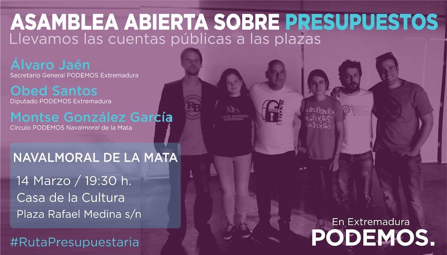 Desde Podemos Extremadura animan a participar a los vecinos del Campo Arañuelo y alrededores, Si quieres conocer a fondo el proyecto de presupuesto presentado por la Junta de Extremadura, te invitamos a esta asamblea abierta donde tendremos la oportunidad de preguntarle a nuestros diputados autonómicos todo lo relacionado con su trabajo en la Asamblea de Extremadura y a los presupuestos regionales.