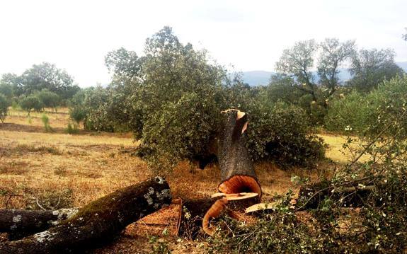 El corte se ha producido en la finca 'La Laguna' y ha afectado a más de 400 ejemplares, algunos de ellos centenarios. De ahí las responsabilidades que se han pedido desde el Ayuntamiento y la denuncia que Adenex va a presentar contra Medio Ambiente «con la intención de revertir el atentado y que los responsables sean castigados».