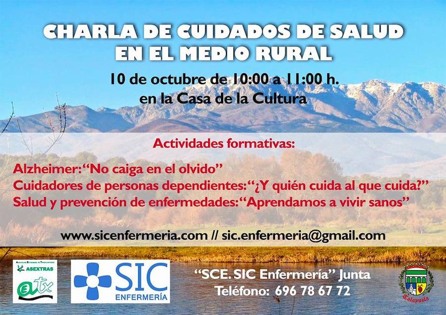 Esta mañana de lunes Asextras y Sic Enfermería impartirán en Talayuela varias charlas sobre cuidados de salud en el medio rural. La reunión tendrá lugar ... de 10.00 horas a 11.00 horas en la Casa de la Cultura.