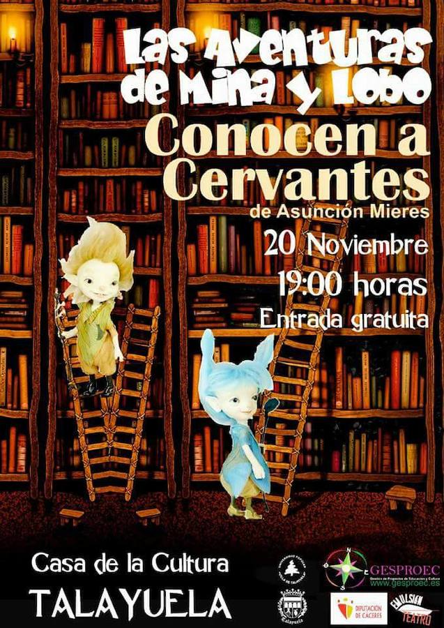 Esta tarde de domingo, día 20 de noviembre, a partir de las 19:00 horas en la Casa de la Cultura de Talayuela se representará ... la obra de teatro para público infantil y familiar Las Aventuras de Mina y Lobo. Conocen a Cervantes. La obra de Asunción Mieres tendrá una duración aproximada de 60 minutos.