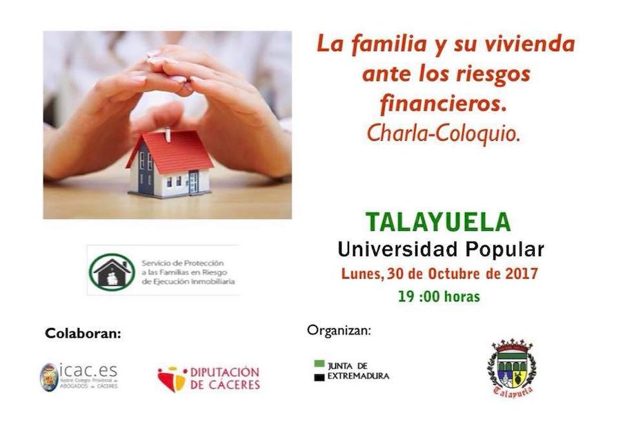 Esta tarde de lunes, día 30 de octubre, a las 19:00 horas se celebrará en la Universidad Popular de Talayuela una charla coloquio en ... la que se abordará el tema de actualidad La familia y su vivienda ante los riesgos financieros.
