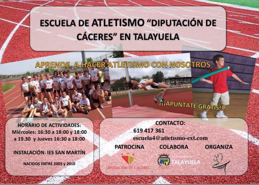 Octubre del 2017 ha traído a Talayuela una de las Escuelas de Iniciación que la Federación Extremeña de Atletismo ha puesto en marcha en diferentes ... zonas de la provincia gracias a un convenio con la Diputación de Cáceres. Para su puesta en marcha se ha contado también con la colaboración del Ayuntamiento de Talayuela que se ha ofrecido a facilitar el uso de las instalaciones municipales para las actividades de la escuela.