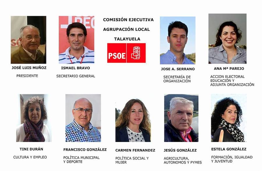 Junto a Ismael Bravo se encargará de la presidencia José Luis Muñoz; Jose Antonio Serrano se ocupará de la secretaría de la organización; Tini Durán se encargará de la secretaría de cultura y empleo; Francisco González, de Política Municipal y Deporte; Carmen Fernández, de Política Social y Mujer; Jesús González, de Agricultura, Autónomos y PYMES; Ana María Parejo, de Acción Electoral, Educación y Adjunta a la Organización y Estela González, de Formación, Igualdad y Juventud.