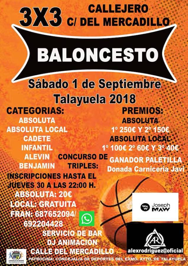 Un año más llega el evento 3x3 Baloncesto en Talayuela patrocinado por la concejalía de Deportes del Ayuntamiento de la localidad, que tendrá lugar el próximo sábado 1 de septiembre. Serán muchas las novedades para esta cuarta edición entre las que destacan el formato callejero, animación con castillo hinchable para los más pequeños y actuaciones dj a partir de la media noche.