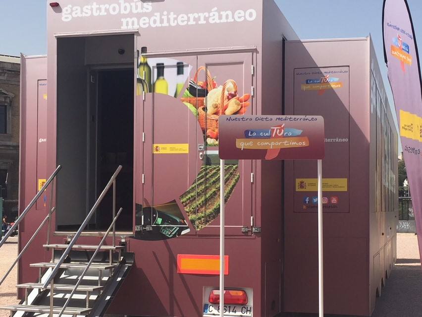 Durante seis meses el MAPAMA ha puesto en marcha el Gastrobús Mediterráneo para dar a conocer los beneficios de una alimentación variada y equilibrada, así como la Pirámide de la Dieta Mediterránea, dentro de la campaña Cultura Mediterránea 2018 2019 y bajo el lema Nuestra Dieta Mediterránea. La culTÚra que compartimos