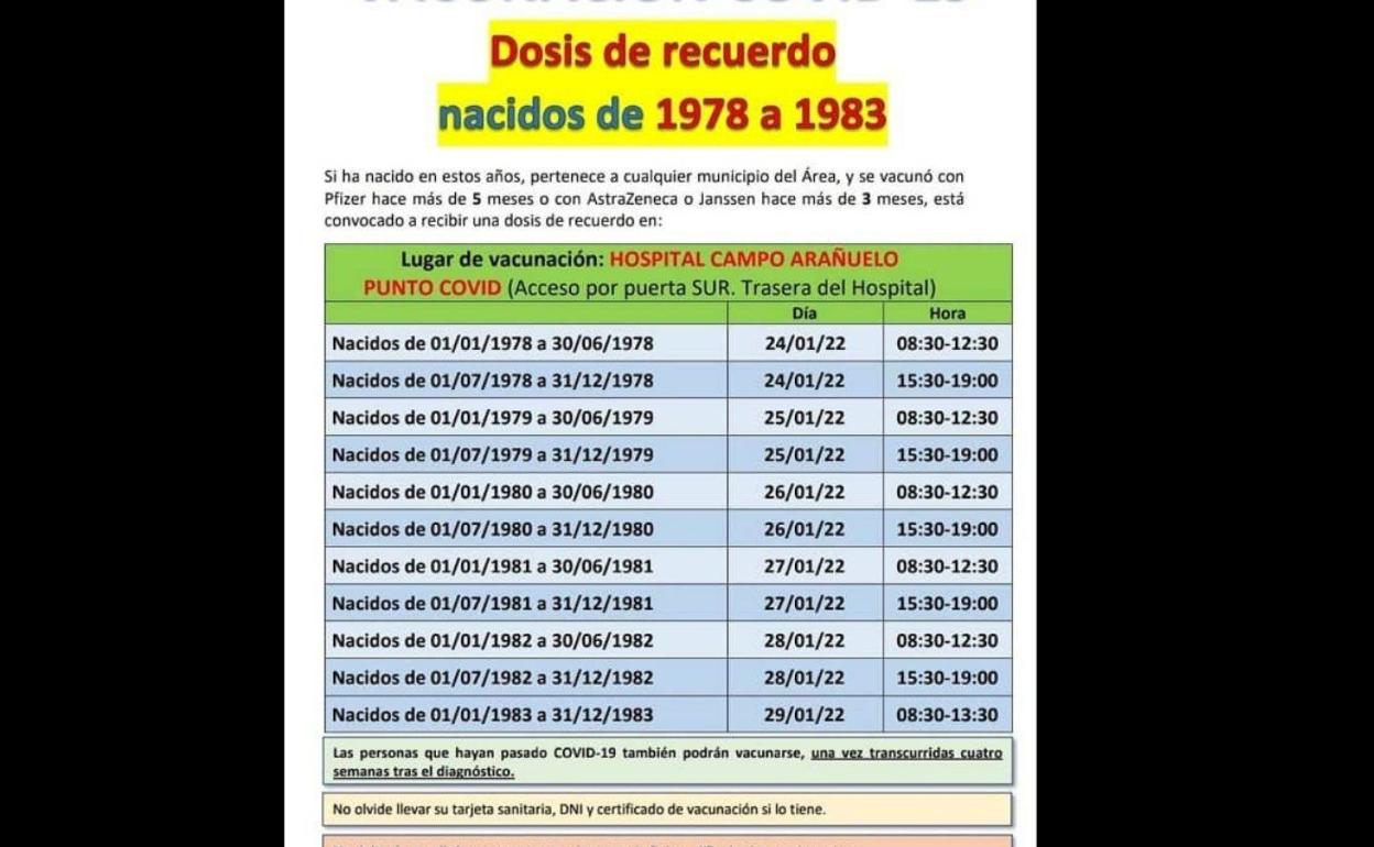 Si ha nacido en estos años, pertenece a cualquier municipio del área de Navalmoral y se vacunó con Pfizer hace más de 5 meses o con Astrazeneca o Janssen hace más de 3 meses, está convocado a recibir una dosis de recuerdo en el punto covid del Hospital Campo Arañuelo.