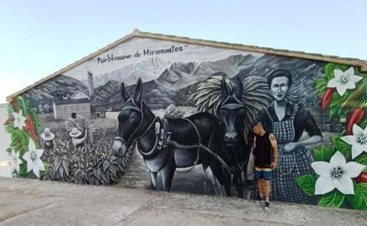 La plaza de Los Colonos de Pueblonuevo de Miramontes luce ya su nuevo mural, creación del grafitero Fabián Murillo, alias Bear Tck. Se trata de un homenaje a las personas que hace décadas se desplazaron hasta este lugar haciendo muchos sacrificios.