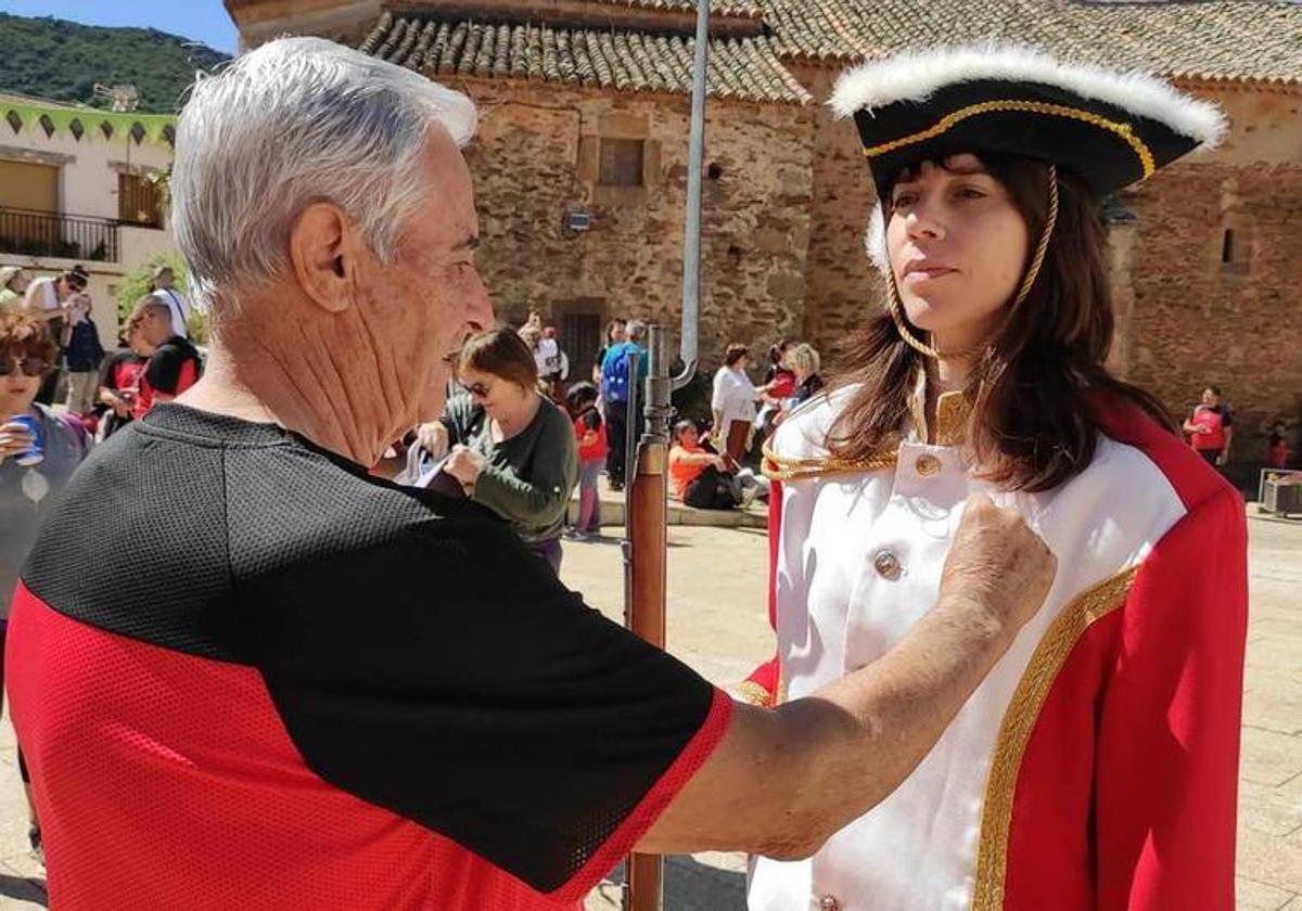 El alcalde de Romangordo, Evaristo Blázquez, impuso el sábado a Eva Jiménez un pin del 'sable de oro' de los que el Ayuntamiento viene concediendo en los últimos años a personas y entidades que colaboran en la organización y desarrollo de la Ruta de los Ingleses. Y éste ha sido, sin duda, el más emotivo al entregarse a la hija del recordado Marcial, fallecido hace unos meses y que impuso su personal sello en su caracterización de general del ejército inglés.