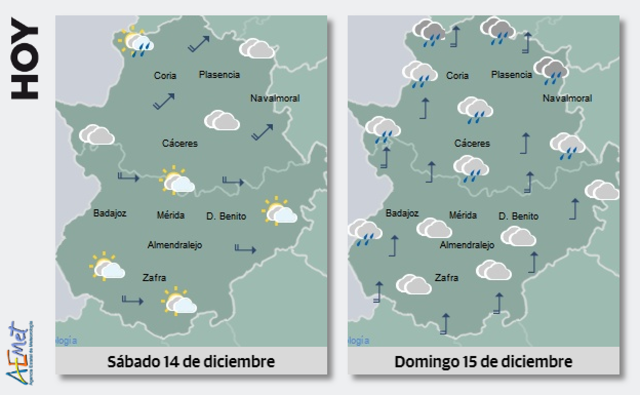 La Agencia Estatal de Meteorología (Aemet) prevé para lluvia en la región para este fin de semana. El sábado habrá cielos nubosos con probables precipitaciones ... en el norte de Cáceres y algo de lluvia débil dispersa en el resto.
